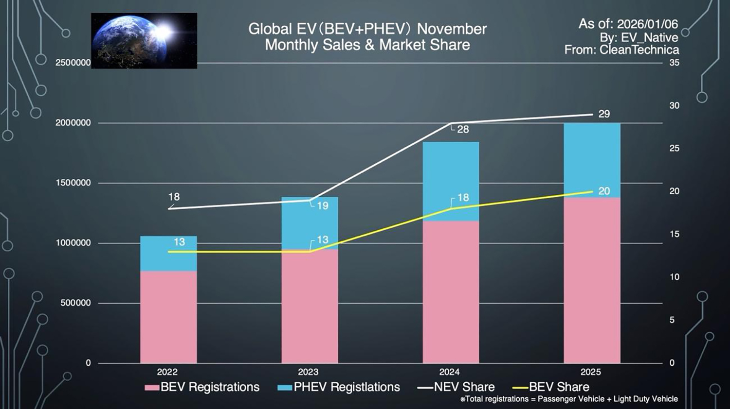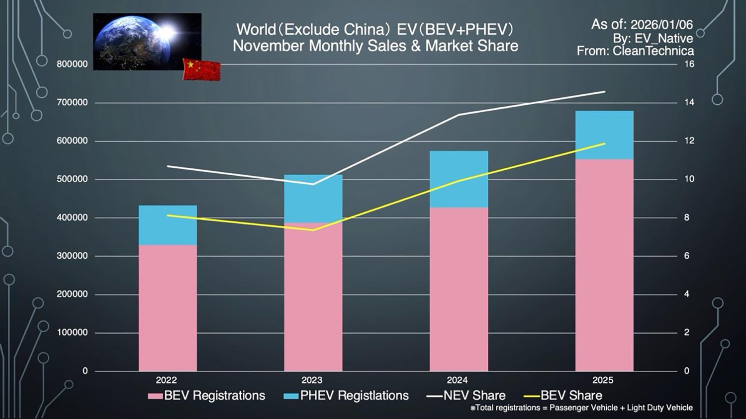 2025年11月最新における世界全体でのEV販売動向が判明しました。EVシフト減速といわれるなか、世界全体でどれほどEVシフト進んでいるのかを分析します。