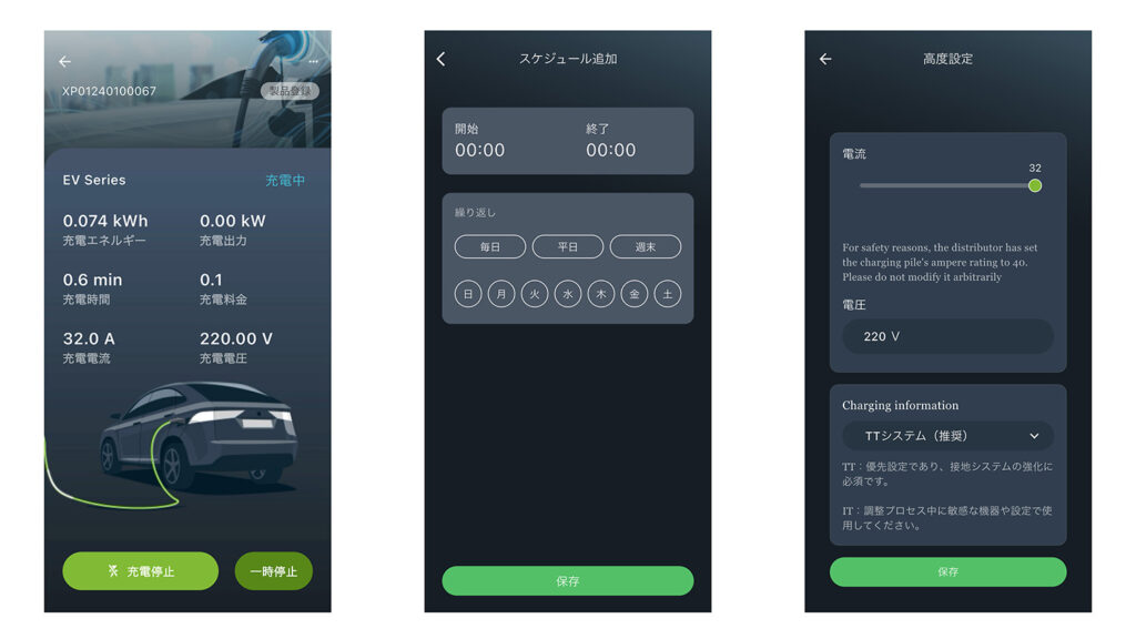 日本で取り扱っている「EVシリーズ」には、シンプル機能の『EV Life』、RFID(充電カード)が使えるグレードアップ版の『EV Life Plus』、7インチディスプレイのついた最上位機種『EV Premium』の3機種。いずれもモバイルアプリでユーザー認証や充電スケジュールの管理ができるというのが特徴です。
